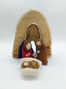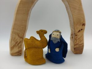 Három pásztor, három bárány, egy kutyus, aki tereli őket. Az angyal, aki megjelent a pásztoroknak álmukban. Egy csillag, ami mutatja az utat a három királynak, és a királyok hátasainak, egy lónak, egy tevének és egy elefántna. Egy kislány és egy kisfiú, ami a gyerekeknek biztosan fontos lesz, így egy kicsit magukat is belejátszhatják a történetbe. A gyerekeket nyugodtan megváltoztathatod, ha a családban több vagy kevesebb gyerek van. Egy kiscica, hogy a kislánynak is legyen mivel játszani. Azután a fogadóst készítjük el, majd egy ökröt és egy szamarat, akik melegítik a kisded számára az istállót. Végül a Szent Család bújik elő a zsákokból.
