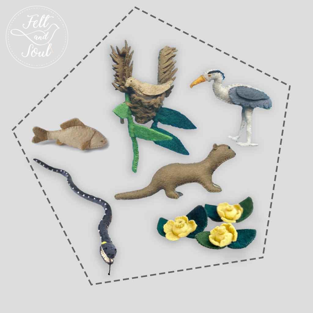 Ennek a szabásminta csomagnak a segítségével vízi világot teremthetsz, saját kis tavad lehet gyapjúfilc figurákból. Lépésről lépésre, mindent megtalálsz a leírásban. Ha csak egy-két vízi állatot vagy növényt szeretnél megvarrni, külön-külön is megvásárolhatod a vidra, a szürke gém, a ponty, a nádirigó, a vízisikló, a nád és gyékény vagy a vízitök szabásmintáit.